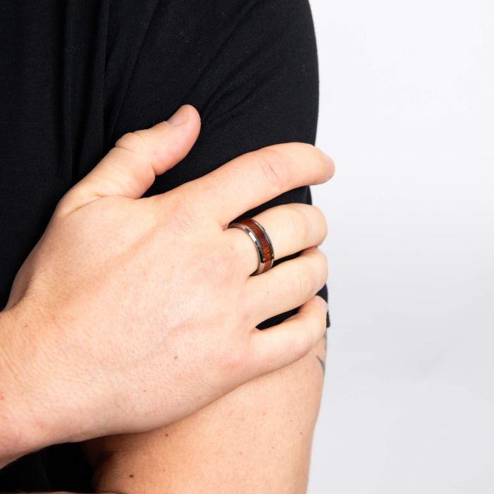 For the man who appreciates a unique blend of nature and modernity, this ring is an exceptional choice. Meticulously crafted from high-quality tungsten, this ring offers unparalleled durability and strength, ensuring it remains a lasting symbol of your commitment. The addition of the brown wood inlay introduces a warm, natural element that beautifully contrasts with the sleek, polished tungsten. The rich wood inlay is framed by polished tungsten edges, creating a sophisticated and eye-catching design. This harmonious combination of materials results in a ring that is both rugged and refined, suitable for any occasion.