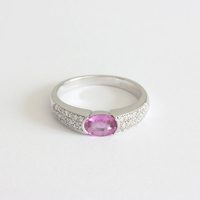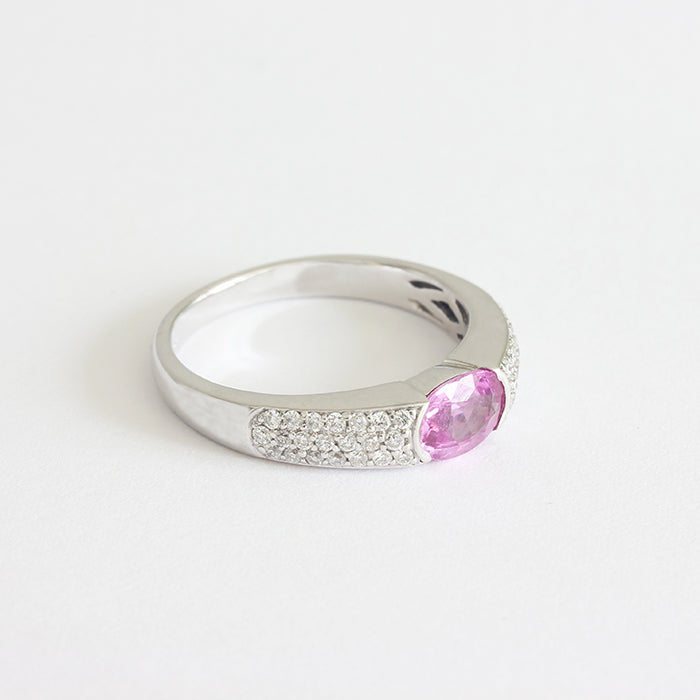 A forty three stone oval faceted pink sapphire and modern brilliant cut diamond ring in 18 carat white gold. The sapphire is rub-over set at each end with a pave diamond setting either side. Plain shank.
